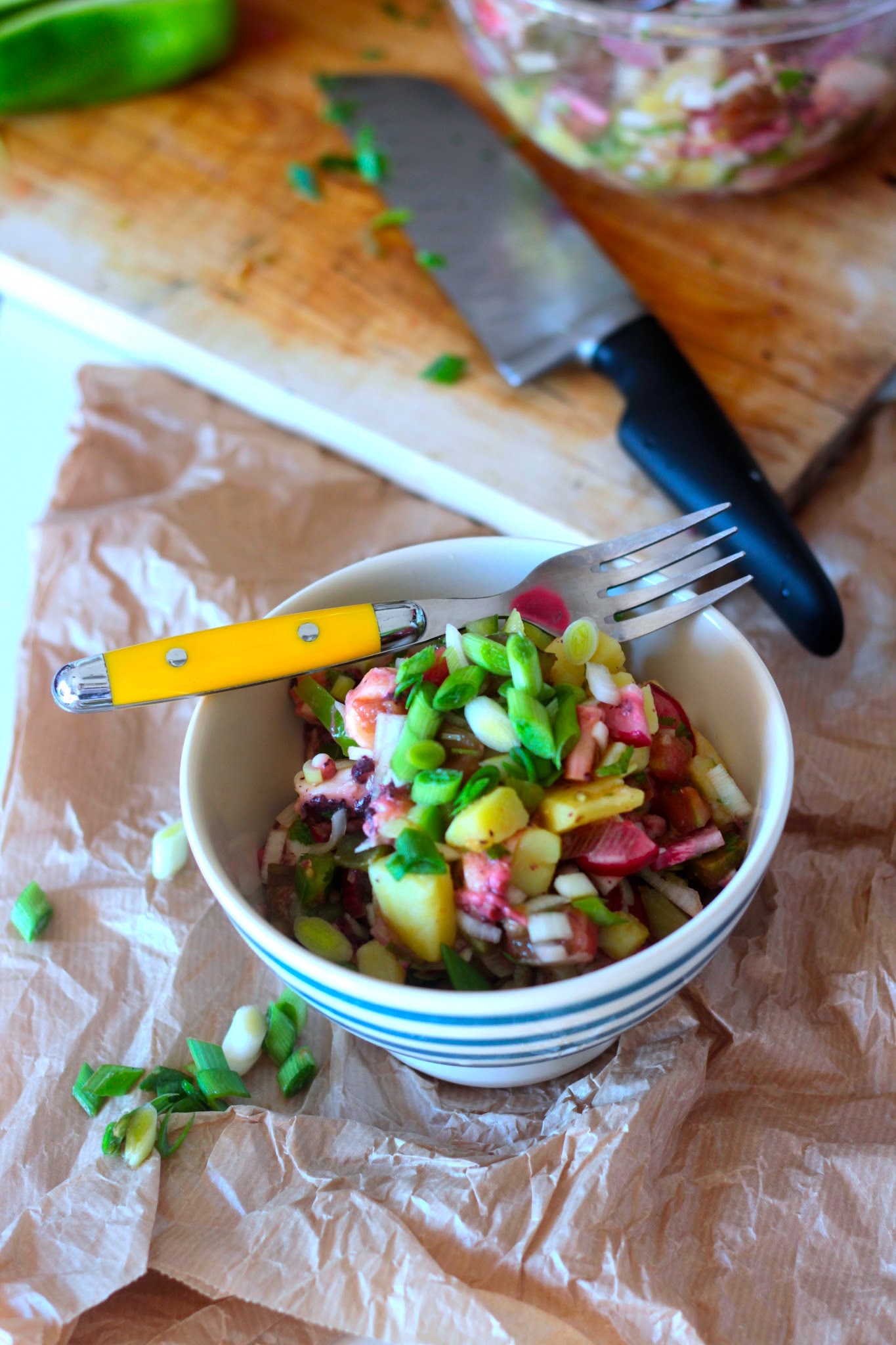 Entretanto lave bem todos os legumes. Pique finamente a cebola e os dentes de alho e coloque-os numa saladeira. Corte depois o pimento em cubinhos, assim como o tomate e coloque-os também na saladeira. Corte os rabanetes em pedacinhos e pique os coentros e as “spring onions” e corte o polvo em pedacinhos pequenos. Coloque tudo na saladeira, acrescente a batata doce previamente escorrida e tempere com um pouco de sal e pimenta, azeite e um pouco de vinagre envolvendo bem.