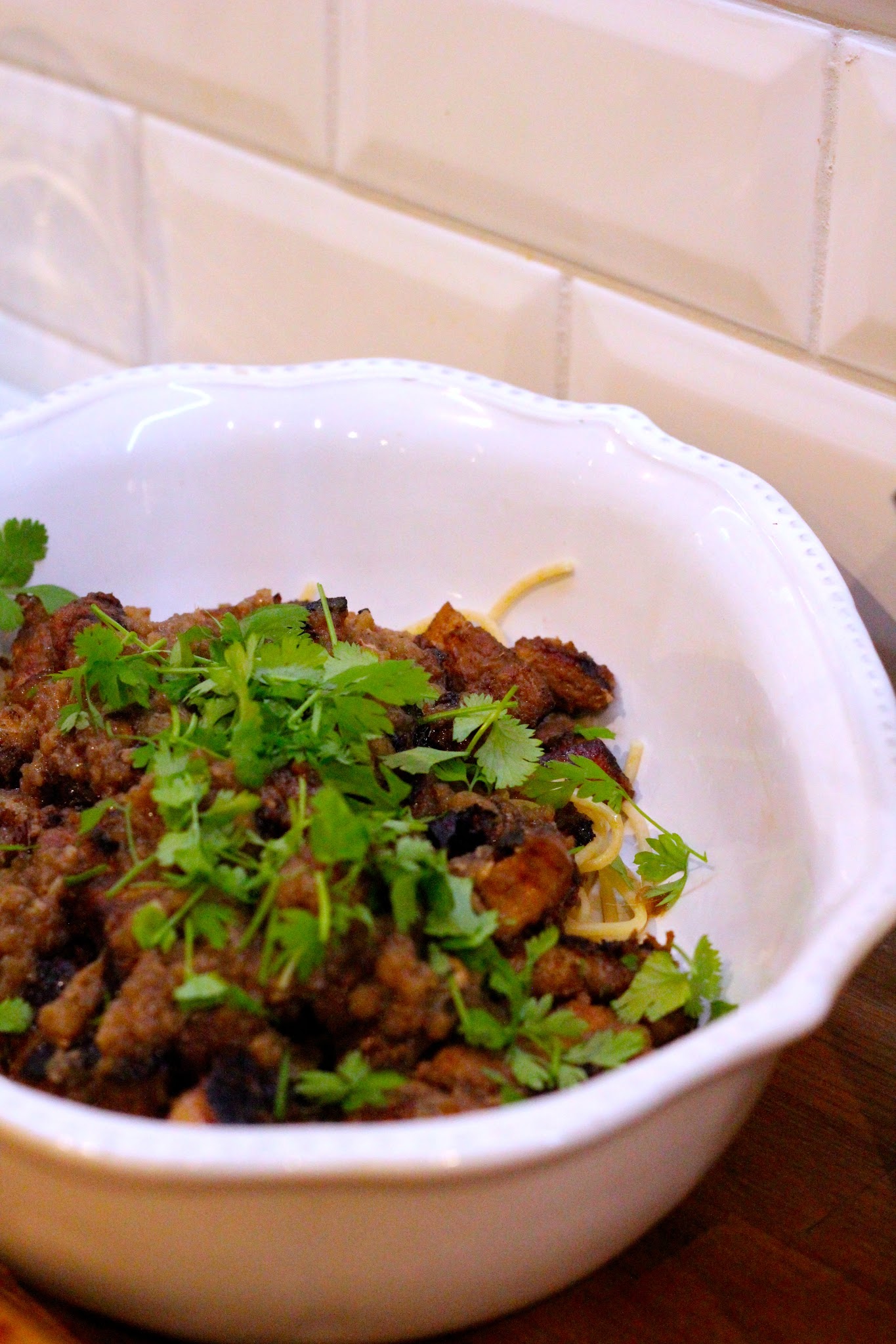 Sirva depois a carne de porco com esparguete ou noodles e regue com um pouco de molho da marinada e polvilhe com coentros frescos picados.
