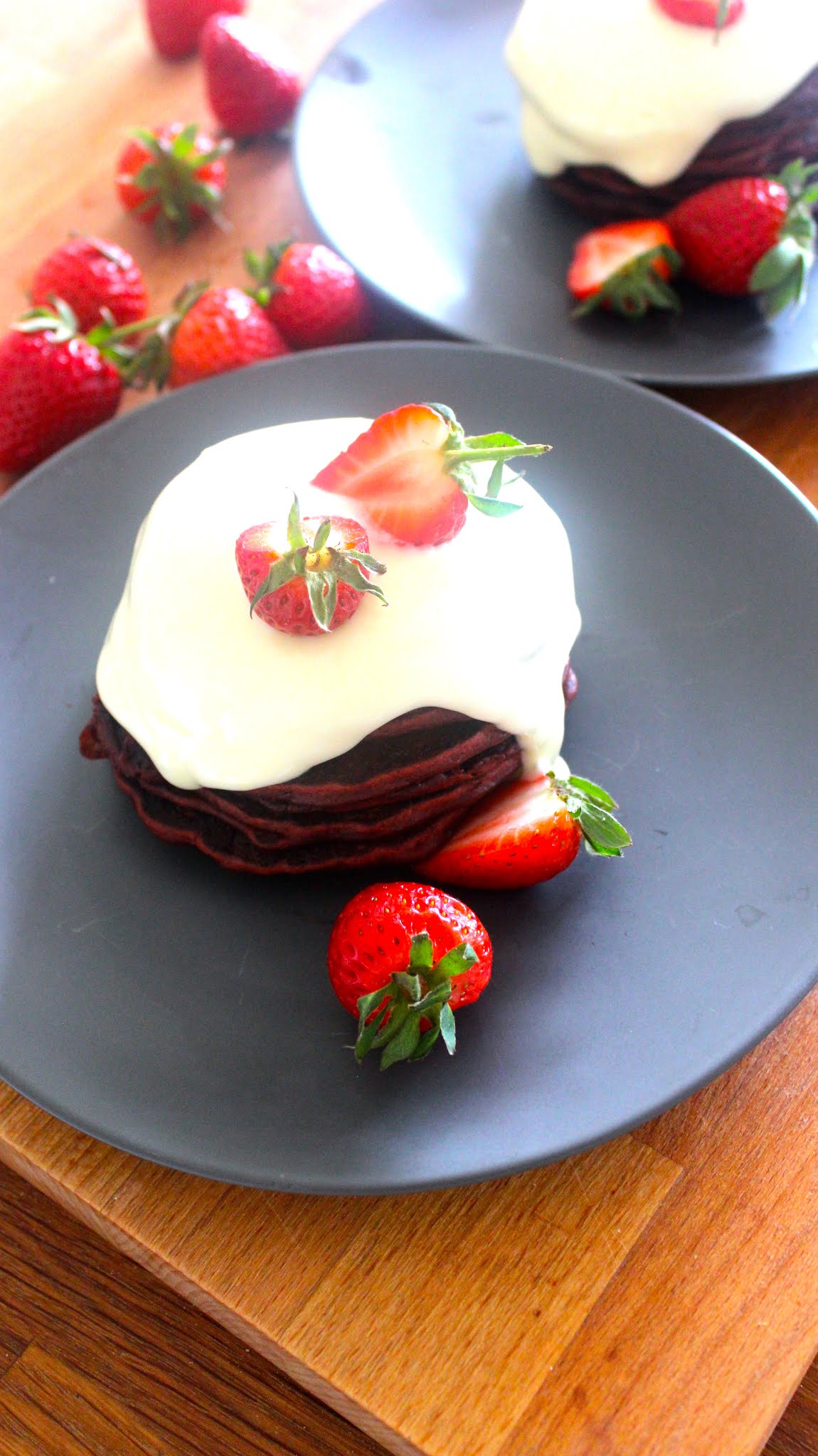 O video já foi filmado há uns tempos, mas nesse dia não resisti a partilhar uma foto destas deliciosas panquecas. Houve imensos pedidos de receita, até porque houve quem pensasse que eram panquecas de beterraba… Afinal eram apenas umas fantásticas panquecas de red velvet com uma gulosa cobertura de queijo creme. E acho que são também a sugestão ideal para o fim de semana, para um lanche ou pequeno almoço muito guloso.
