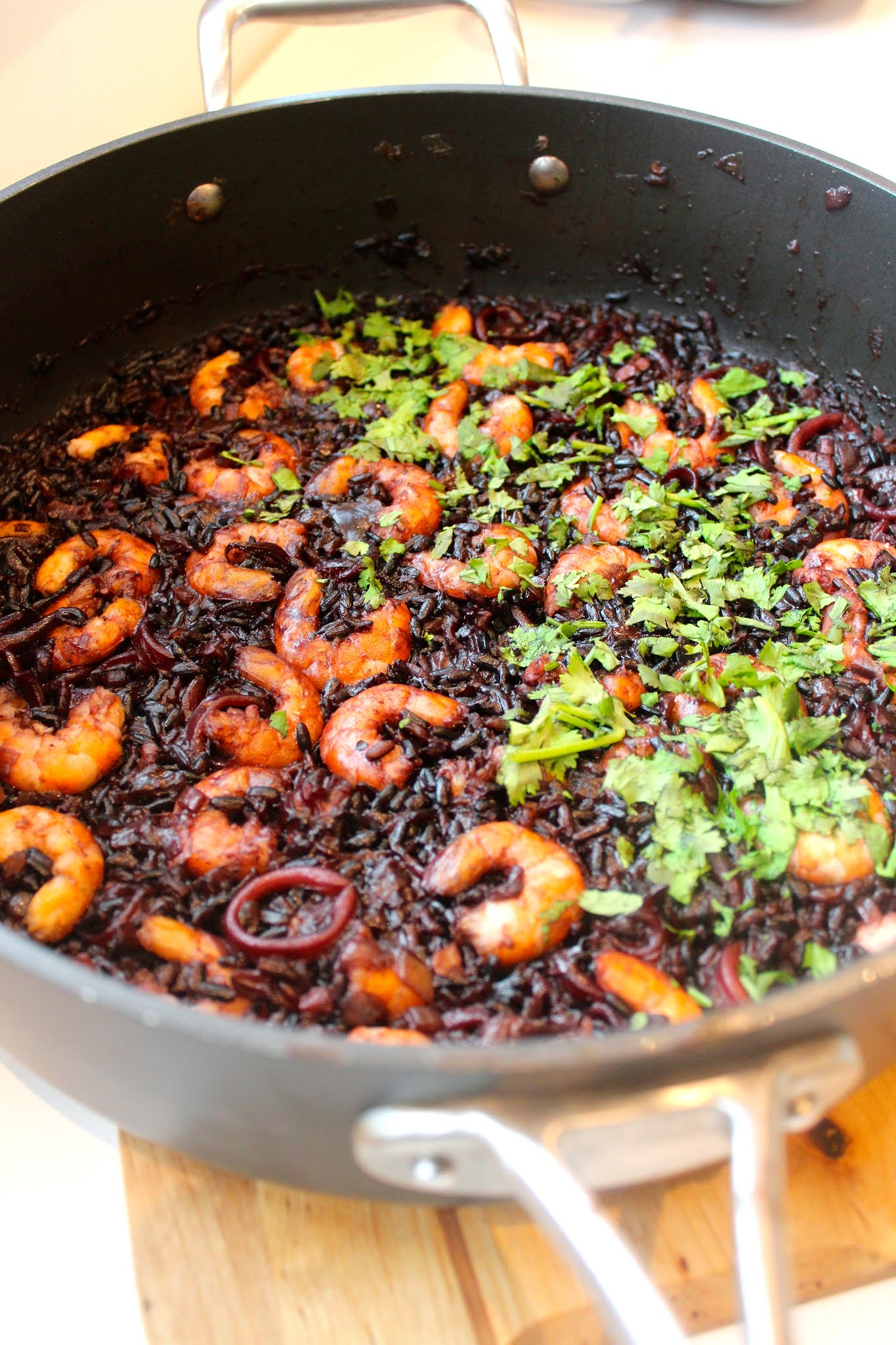 Acrescente agora o arroz negro e envolva bem. Junte o caldo de camarão caseiro ainda quente e deixe levantar fervura, retifique de temperos e reduza o lume para o mínimo e deixe cozinhar tapado, cerca de 20 minutos. Ao fim deste tempo, ainda tem imenso líquido, e o arroz ainda não está totalmente cozinhado. Destape o arroz, e aumente o lume. Deixe cozinhar até o liquido estar quase todo evaporado, mais cerca de 20 minutos. Quando estiver nesse ponto (em que a maioria do líquido evaporou), disponha por cima os camarões e deixe acabar de cozinhar. Estará pronto quando todo o líquido tiver evaporado e parecer que o arroz está a começar a querer agarrar ao fundo do tacho/frigideira.