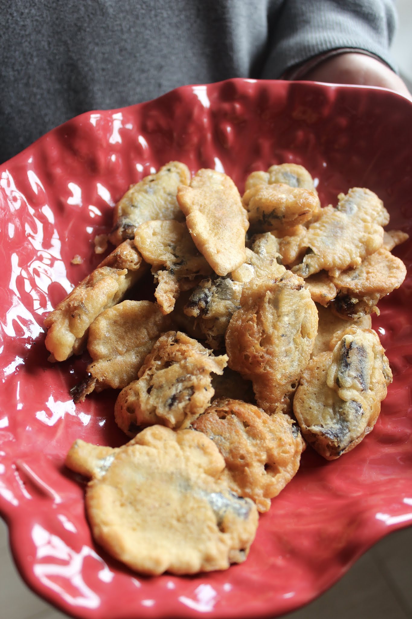 Uma a uma passe as petingas pela polme de modo a que fiquem bem cobertas, e leve-as a fritar em azeite quente até que fiquem douradas.