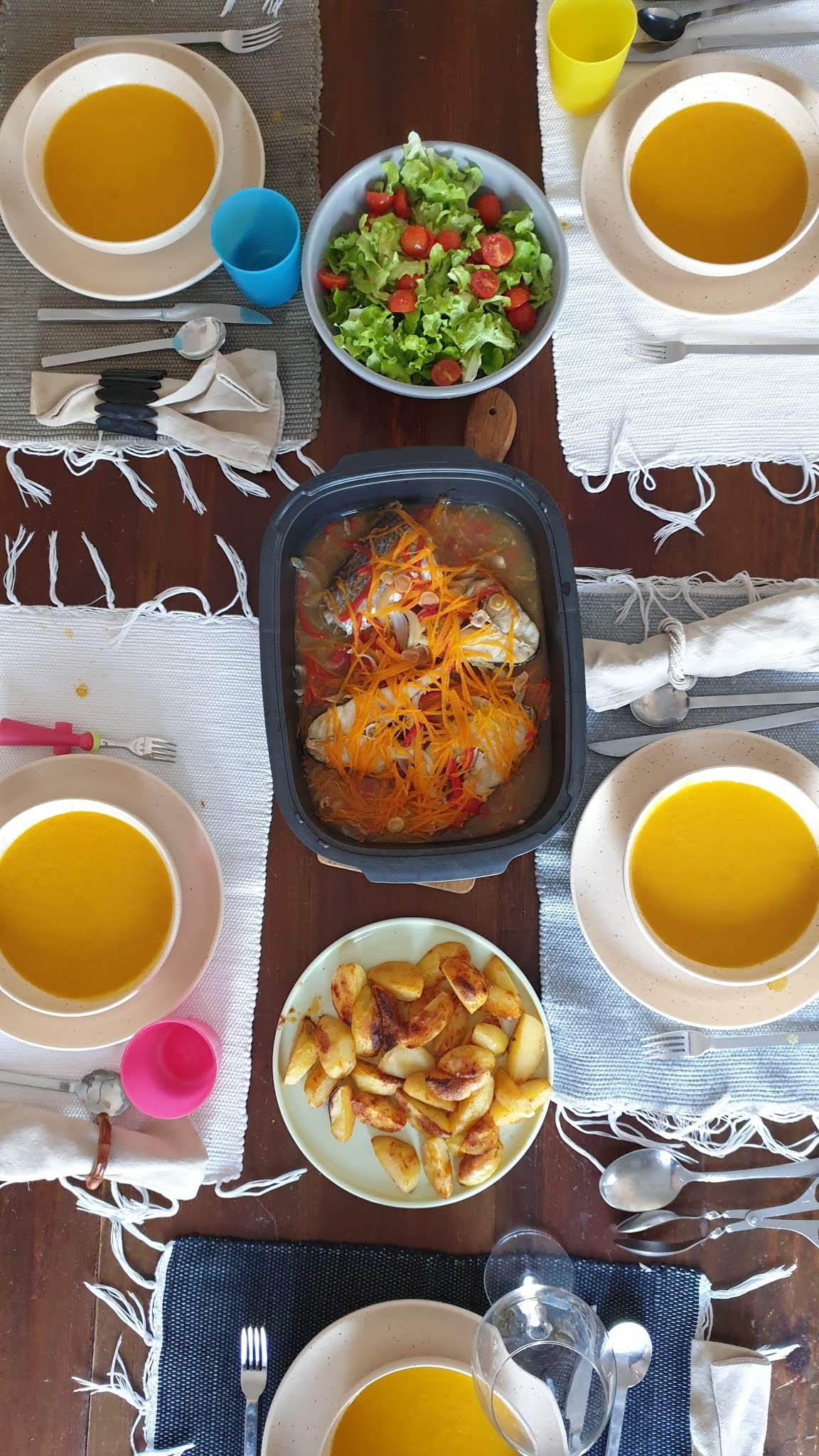 É a segunda refeição que fazemos os 5 partir de uma corvina maravilhosa e grande que comprei. As primeiras postas transformaram-se numa moqueca, e agora foi parar ao forno, com legumes.