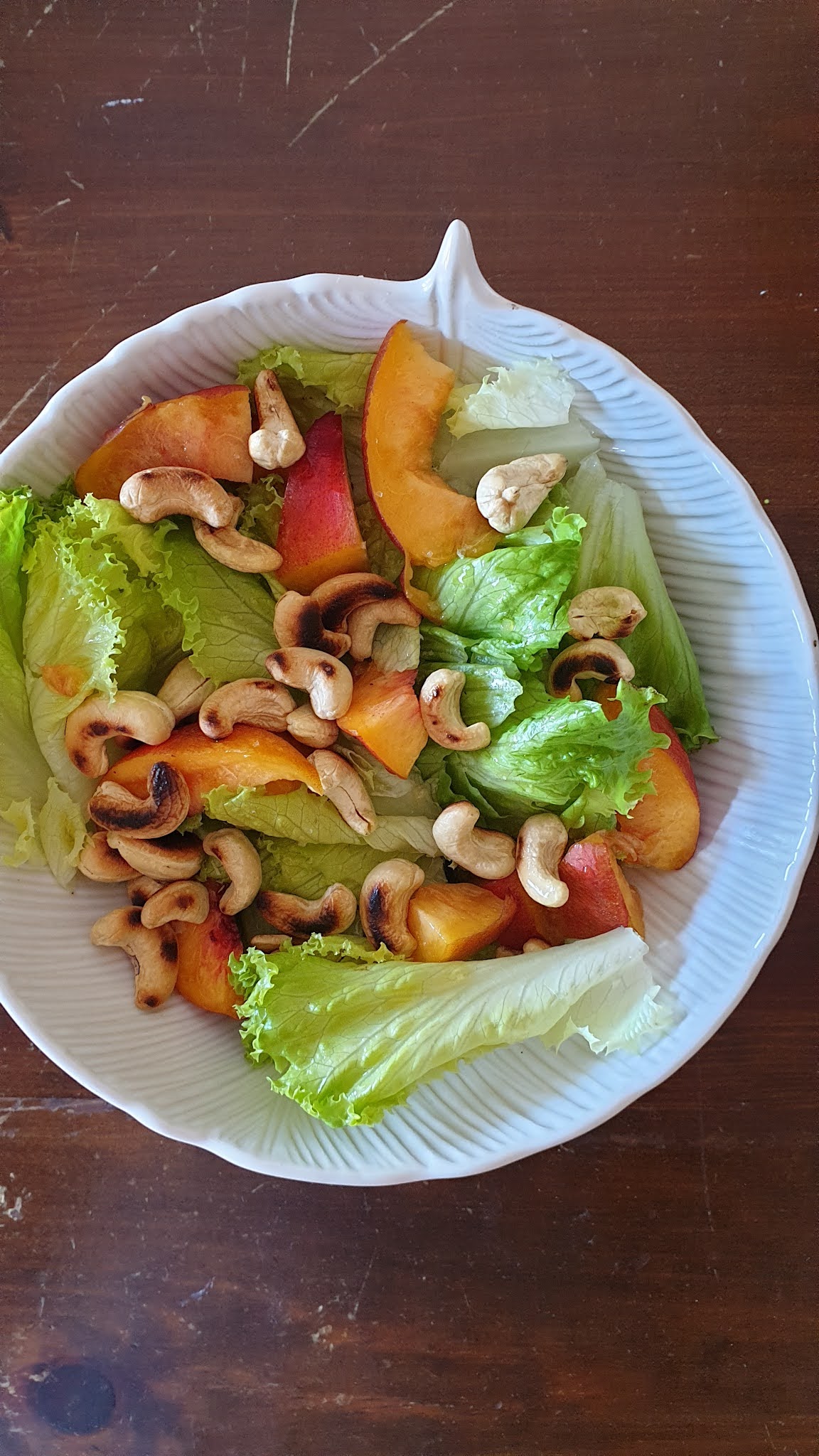 Lave depois os pêssegos e corte-os em fatias ou pedaços. Junte-as à alface assim como os cajus já arrefecidos.